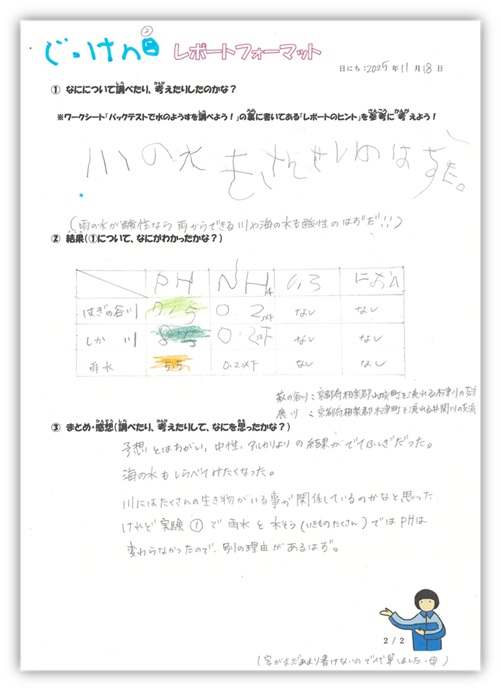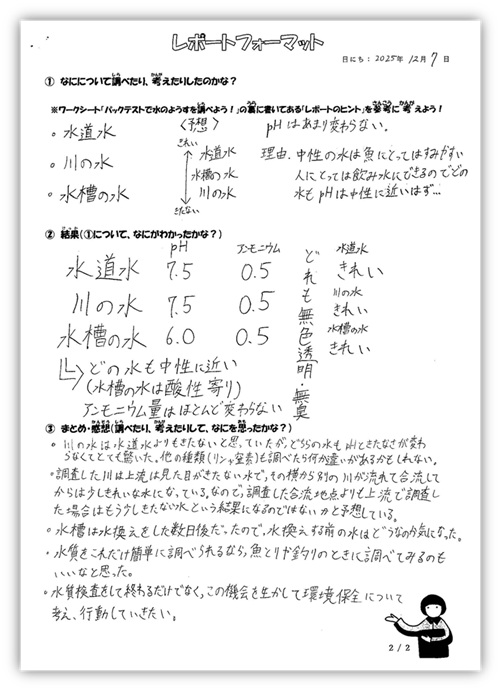 イベントでの水質調査やパックテストをきっかけに、興味や疑問を見つけ、自分の力で考え、調査し、それをレポートにまとました。その行動力に、まずは大きな拍手をお送りします。