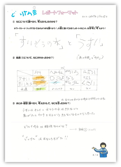 雨水と水槽の水で数値が異なることに気づき、「魚が糞をするからではないか」と自分なりの答えを導き出しました。