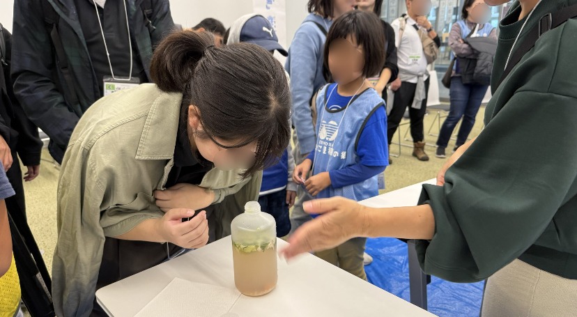 測定に使った水「③食器を洗ったあとの台所に溜まった水」の本当の姿をお披露目。今回は実験のために「調理する前に出た野菜くずや生肉などを入れた水」を用意し、それを薄めた水を測定しました。実験に使ったときよりも、もっと濁って臭いのする水を見て子どもたちは「くさい!」と絶叫。とても盛り上がりました。