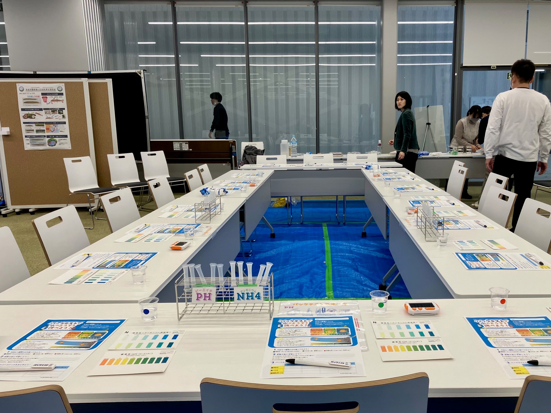 晴れていたら鴨川のほとりで体験プログラムである水質調査、鳴き砂体験、漁師体験、水槽作りの4つの体験を行う予定でしたが、当日はあいにくの雨。子どもたちによる水辺活動の発表会を行う会場である歴彩館で体験プログラムを行いました。